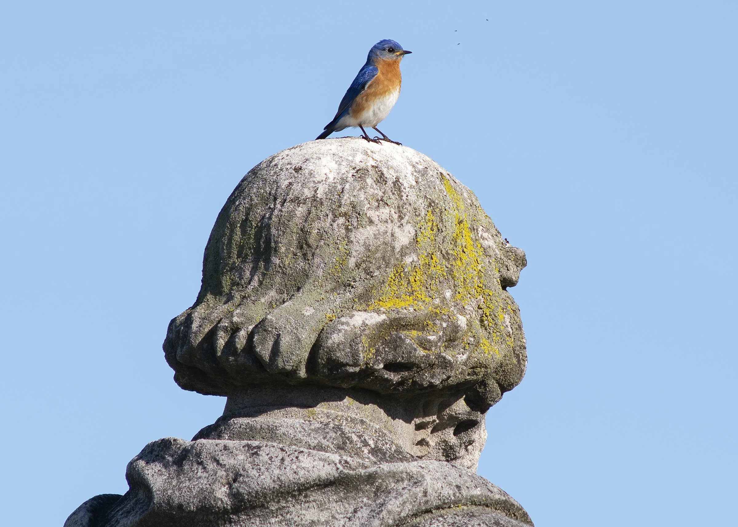 Bluebird atop the reclusive statue of Longfellow in the meadow down from the garden